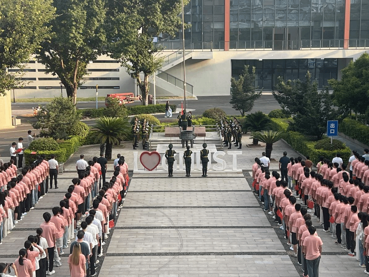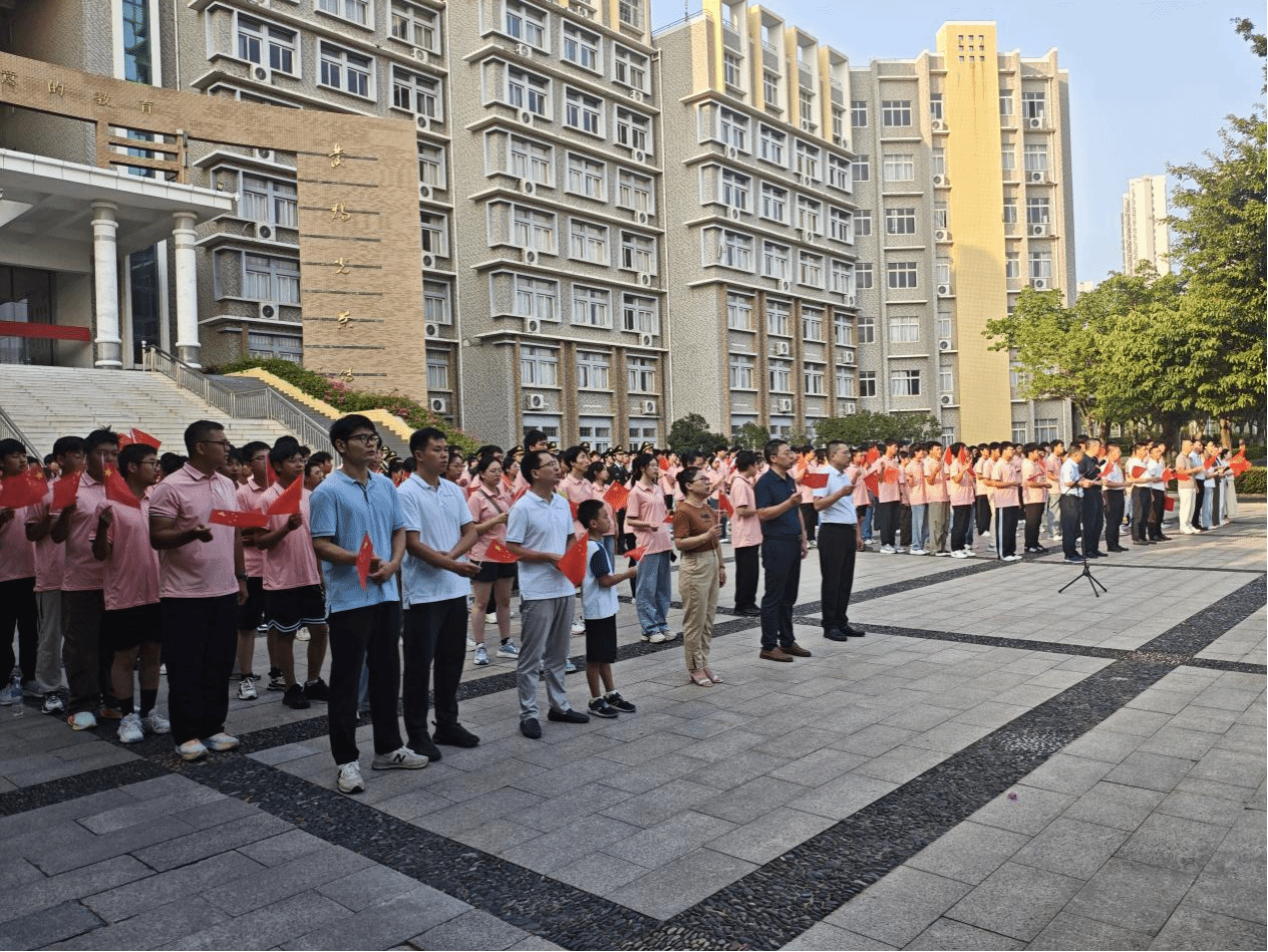 秋日晨光,微风和畅。学校国旗护卫队迈着铿锵有力的步伐,护卫五星红旗行进至旗杆下。全体师生庄严肃立,激昂的《义勇军进行曲》奏响,鲜艳的五星红旗冉冉升起、迎风飘扬,点燃了青年学子心中炽热的爱国之情与报国之志。